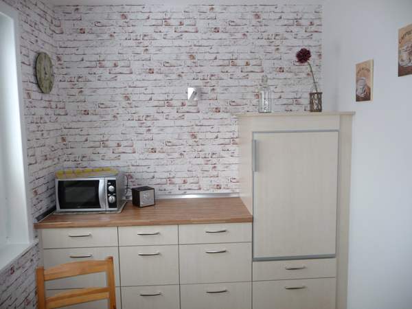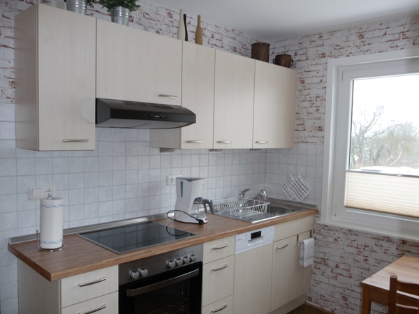 Die Küche ist mit Backofen, Mikrowelle und Geschirrspüler ausgestattet.